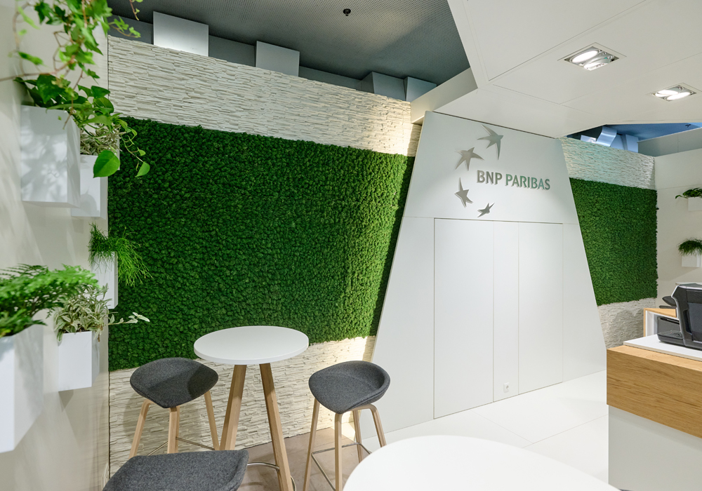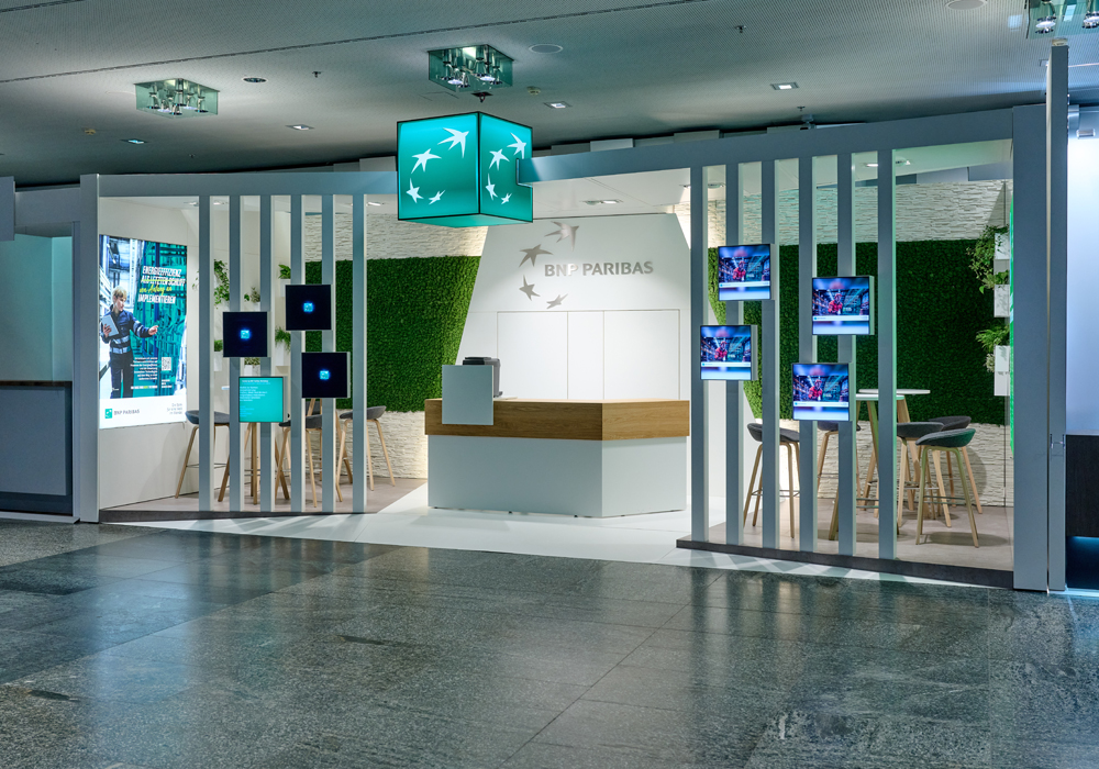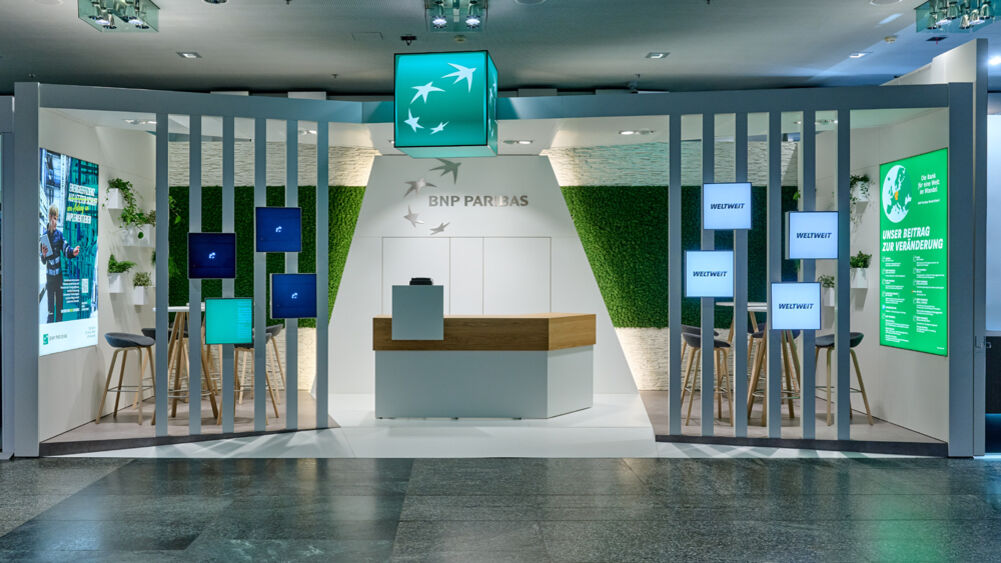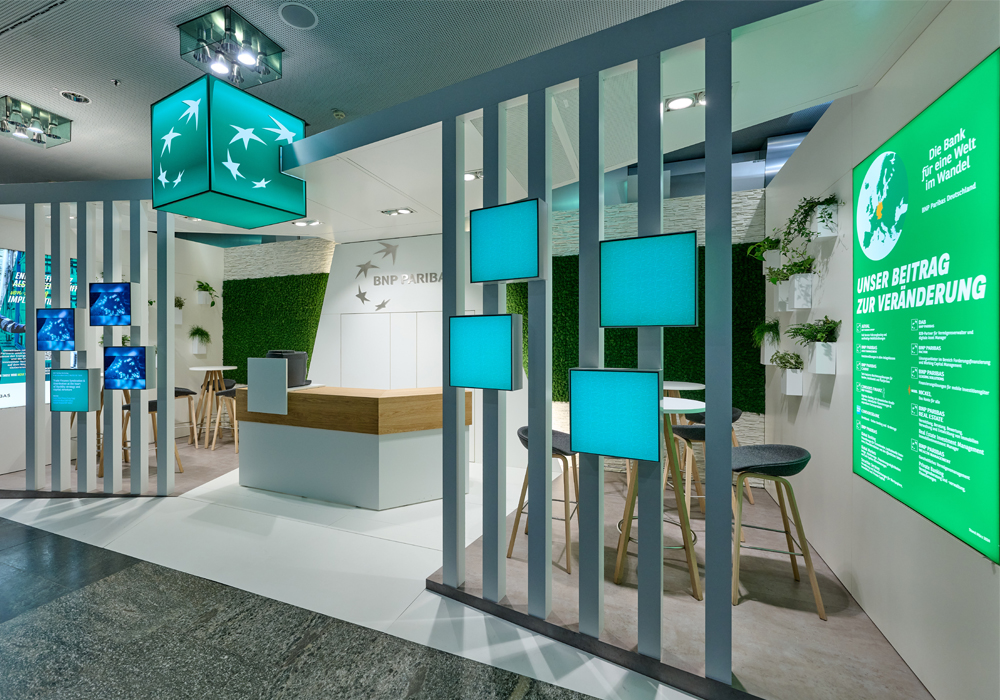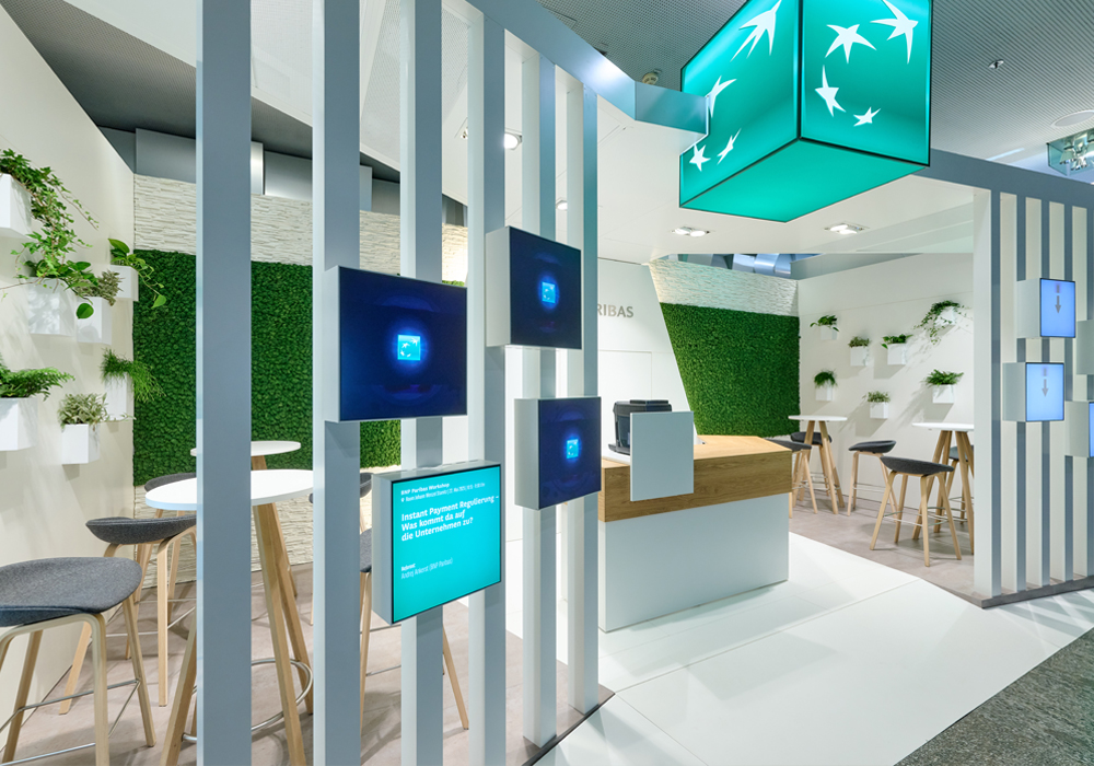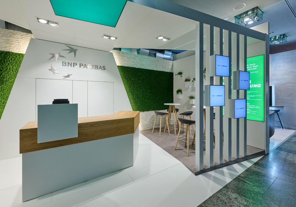 Klein, aber fein: Trotz der kompakten Fläche von 28 qm wirkt der Stand offen und einladend, mit Lounges, clever integriertem Stauraum und einer klaren, modernen Gestaltung. Wie schon in den Vorjahren setzen wir auf hochwertige Materialien und handwerklich präzise Details, die den Auftritt von BNP Paribas charakterisieren.